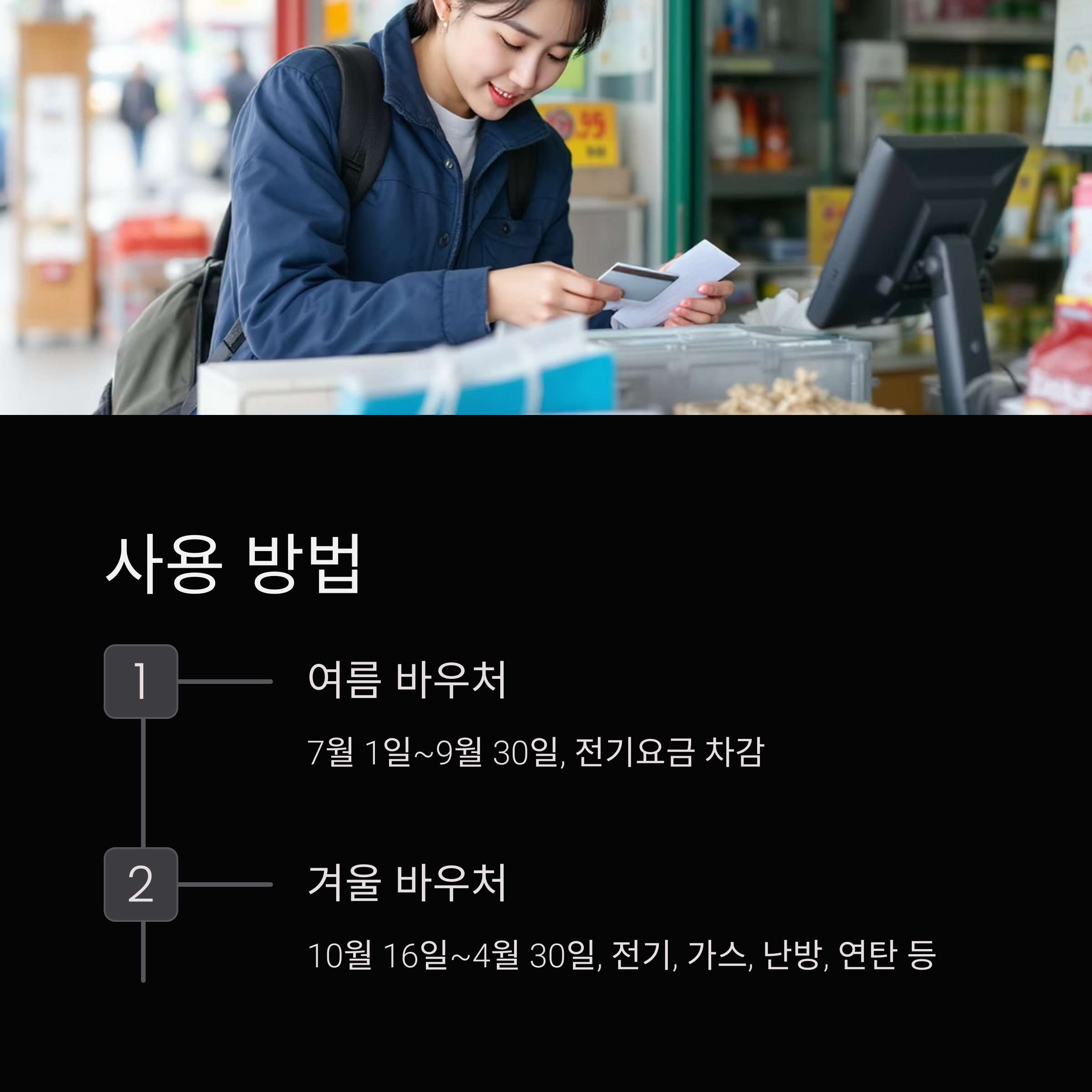 실제 사용 시에는 전기요금에서 자동 차감되거나, 에너지공급사에 등록된 카드나 쿠폰을 통해 결제하는 방식입니다. 각 지역 행정복지센터나 공급사에서 발급해주는 방식에 따라 진행되므로, 바우처 수령 후 사용처를 꼭 확인하셔야 합니다.