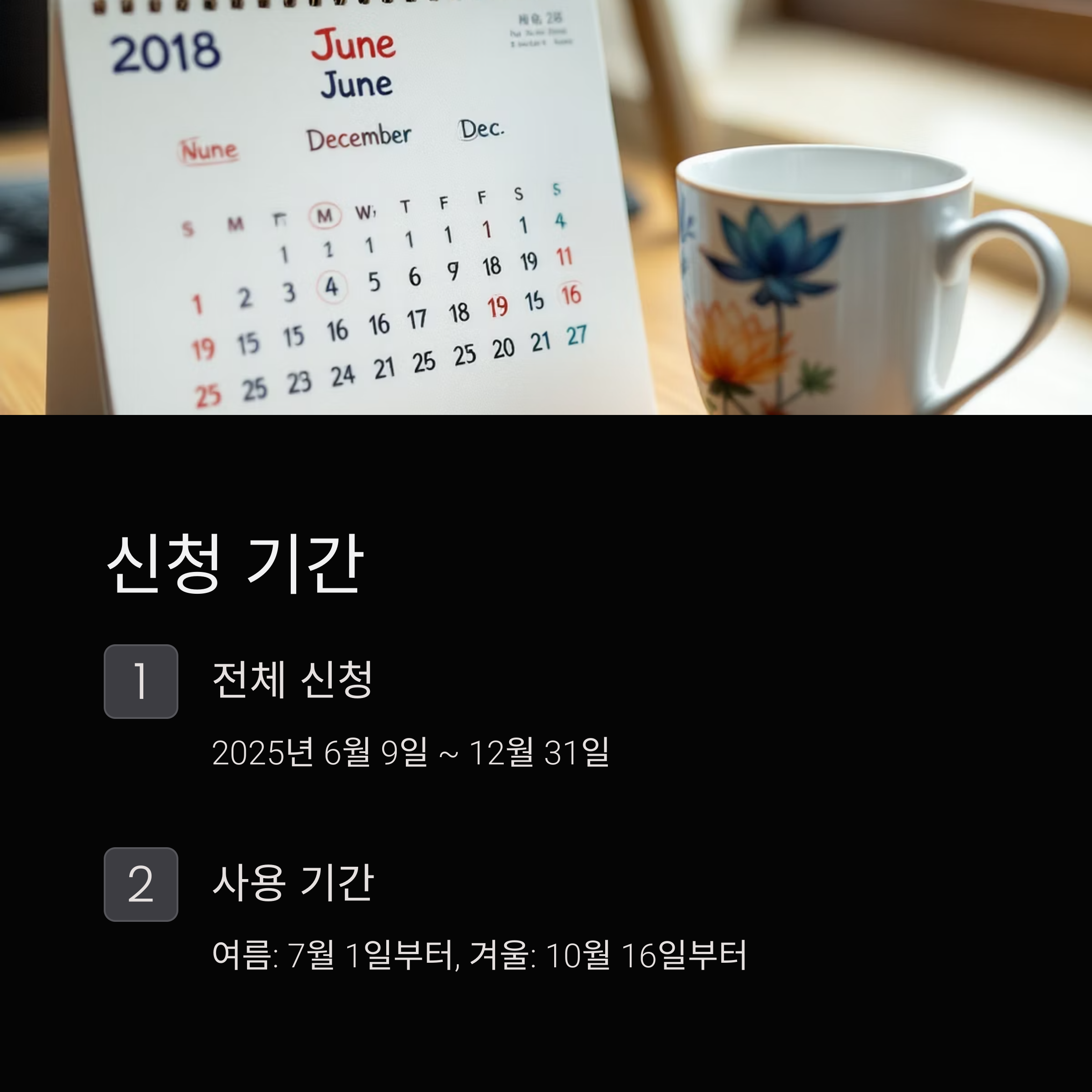 2025년 에너지바우처 신청 기간은 6월 9일부터 12월 31일까지입니다. 단, 여름 바우처는 7월 1일부터, 겨울 바우처는 10월 16일부터 각각 사용할 수 있기 때문에, 빠르면 빠를수록 유리합니다. 신청을 미루지 말고 가능한 한 빨리 가까운 행정복지센터를 방문해 신청을 마치시길 권장드립니다.