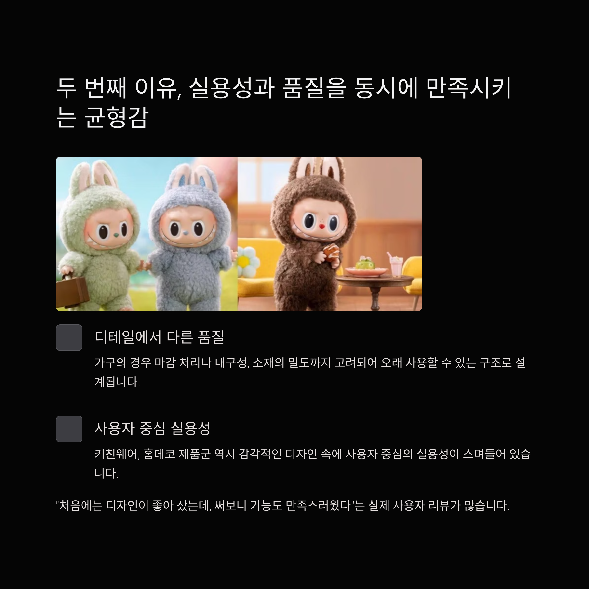 많은 브랜드들이 감성에 집중하면서 실용성을 놓치기 쉬운데, 라부부는 이 균형을 잘 잡고 있습니다. 예쁜 디자인만으로는 고객의 신뢰를 얻기 어렵지만, 라부부는 디테일에서부터 다릅니다. 예를 들어 가구의 경우 마감 처리나 내구성, 소재의 밀도까지 고려되어 오래 사용할 수 있는 구조로 설계됩니다.