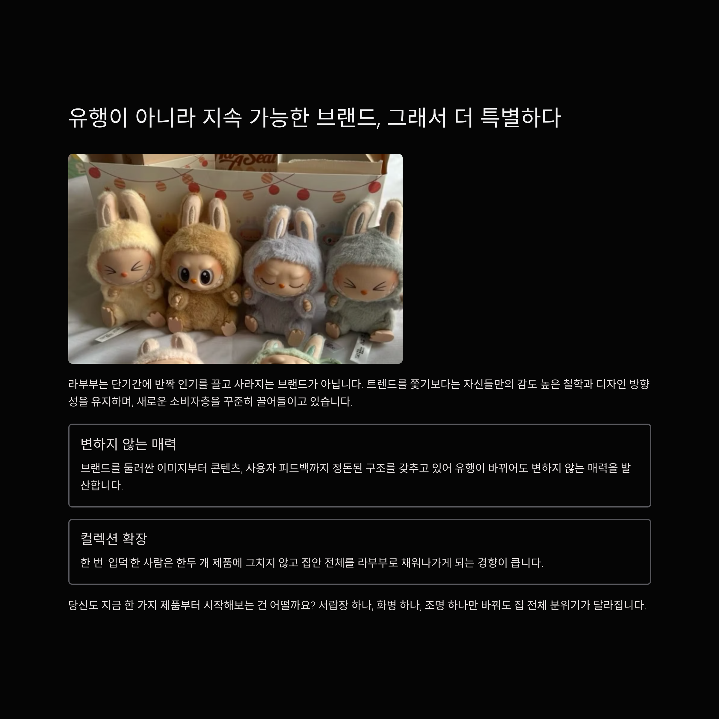 브랜드를 둘러싼 이미지부터 콘텐츠, 사용자 피드백까지 정돈된 구조를 갖추고 있기 때문에 유행이 바뀌어도 변하지 않는 매력을 발산합니다. 그래서 한 번 ‘입덕’한 사람은 한두 개 제품에 그치지 않고 집안 전체를 라부부로 채워나가게 되는 경향이 큽니다.