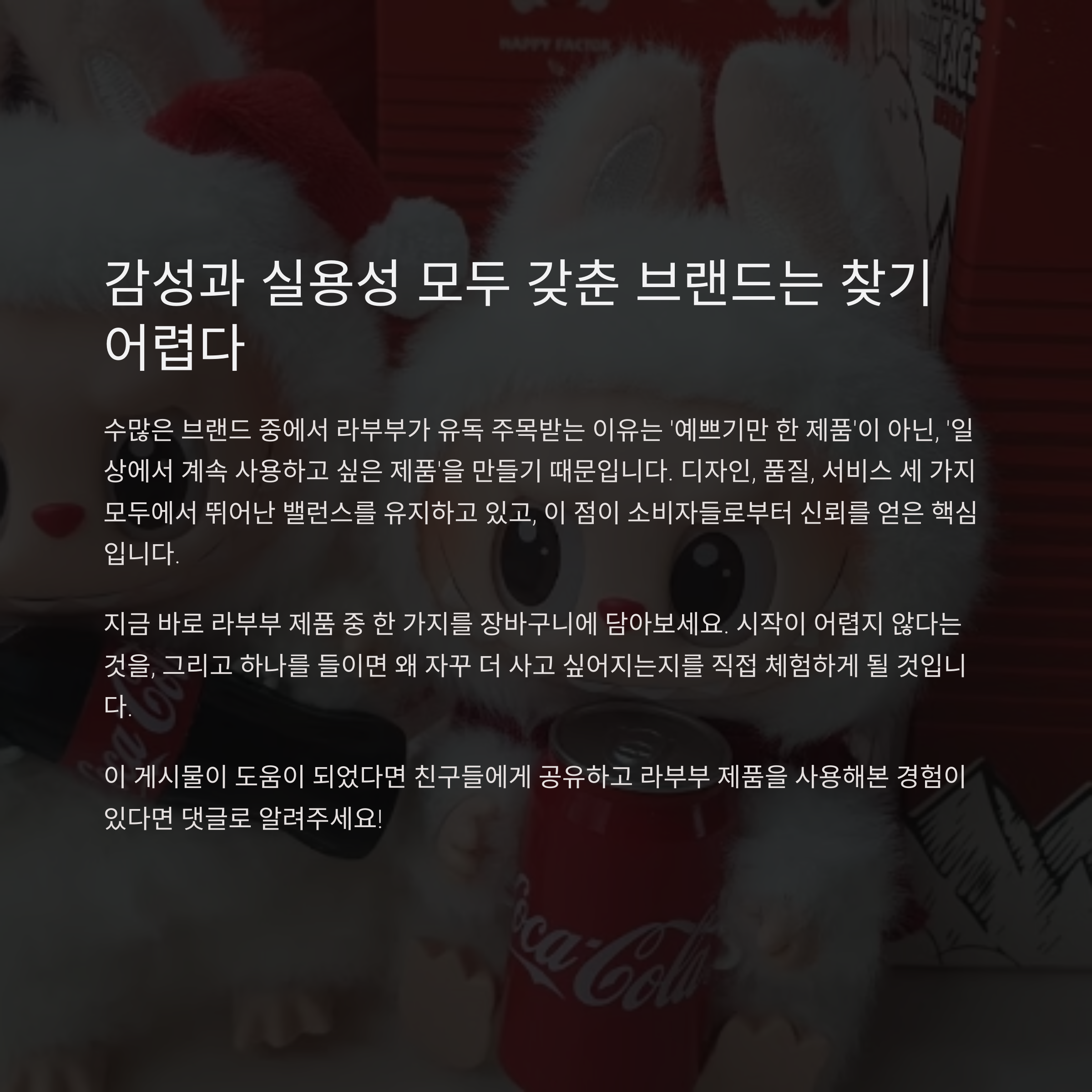 지금 바로 라부부 제품 중 한 가지를 장바구니에 담아보세요. 시작이 어렵지 않다는 것을, 그리고 하나를 들이면 왜 자꾸 더 사고 싶어지는지를 직접 체험하게 될 것입니다.