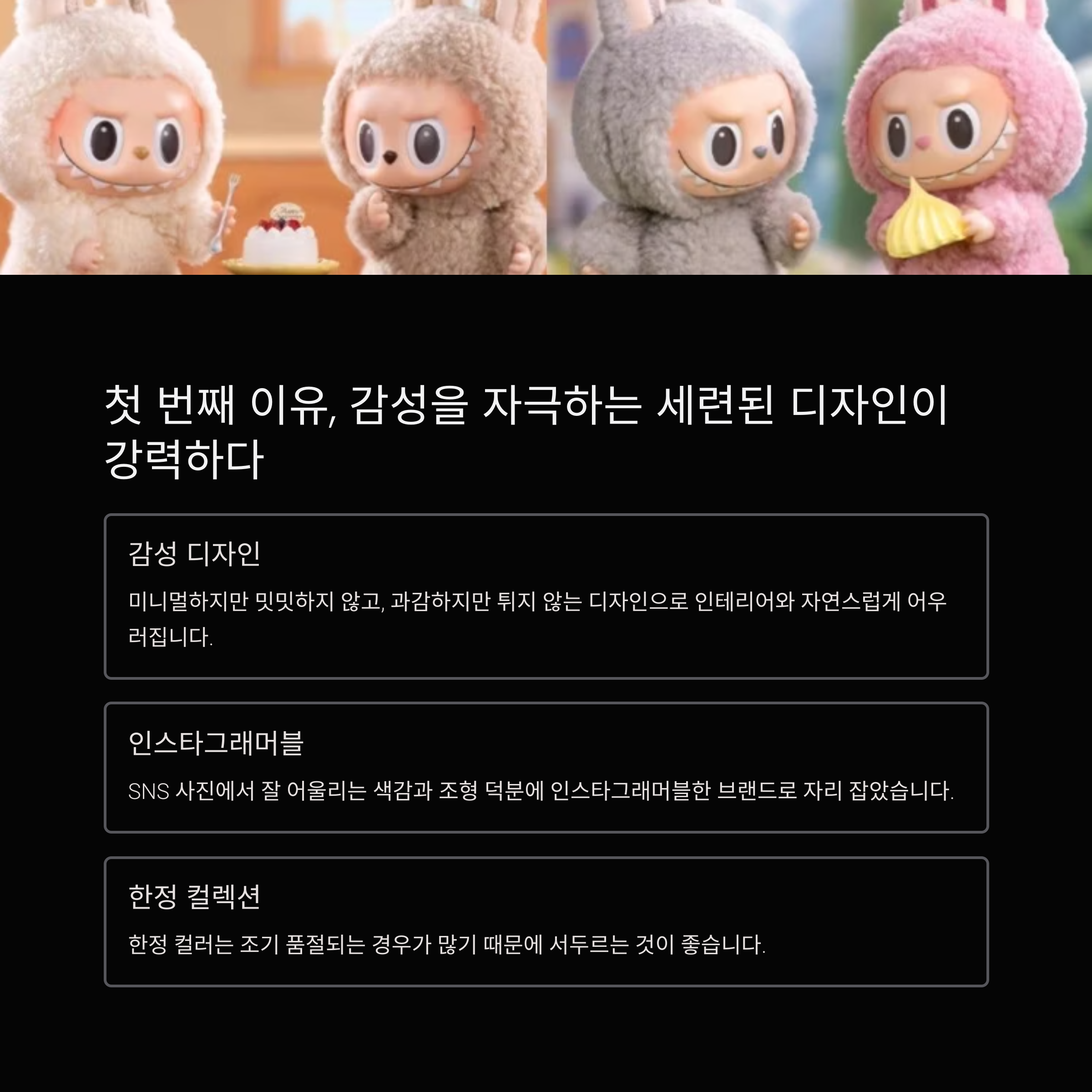 감각적인 무드를 연출하고 싶은 분이라면, 지금 바로 라부부 공식몰에서 베스트셀러 디자인을 확인해보세요. 한정 컬러는 조기 품절되는 경우가 많기 때문에 서두르는 것이 좋습니다.