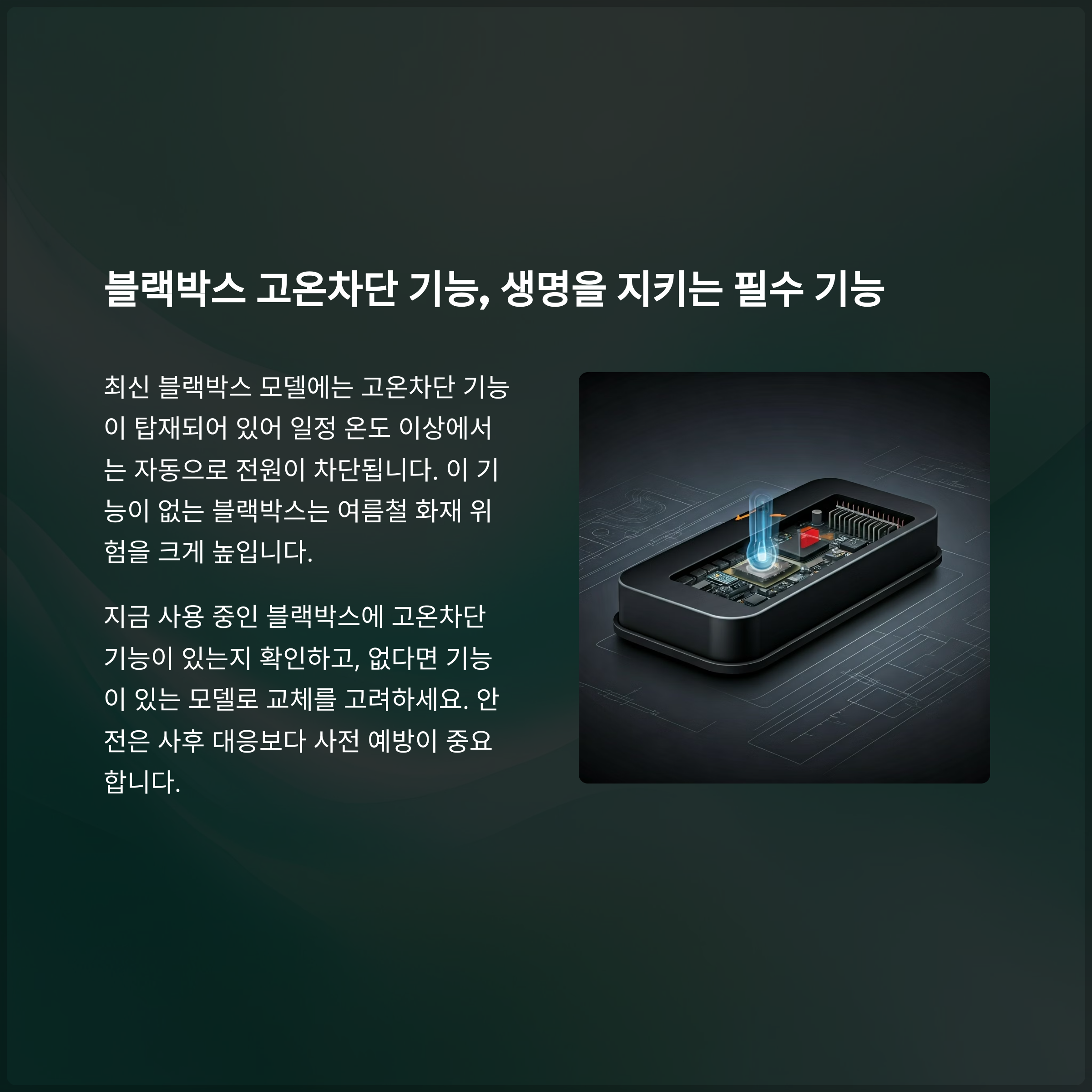 최근 출시된 블랙박스 일부 모델은 고온차단 기능이 탑재되어 있어 일정 온도 이상에서는 자동으로 전원이 차단됩니다. 이 기능이 없는 블랙박스를 사용할 경우, 여름철 차량 화재 위험이 급격히 높아질 수밖에 없습니다. 지금 사용 중인 블랙박스의 사양을 확인하고, 고온차단 기능이 없다면 기능이 있는 모델로 교체를 고려해 보십시오. 안전은 언제나 사후보다는 사전 대응이 중요합니다.