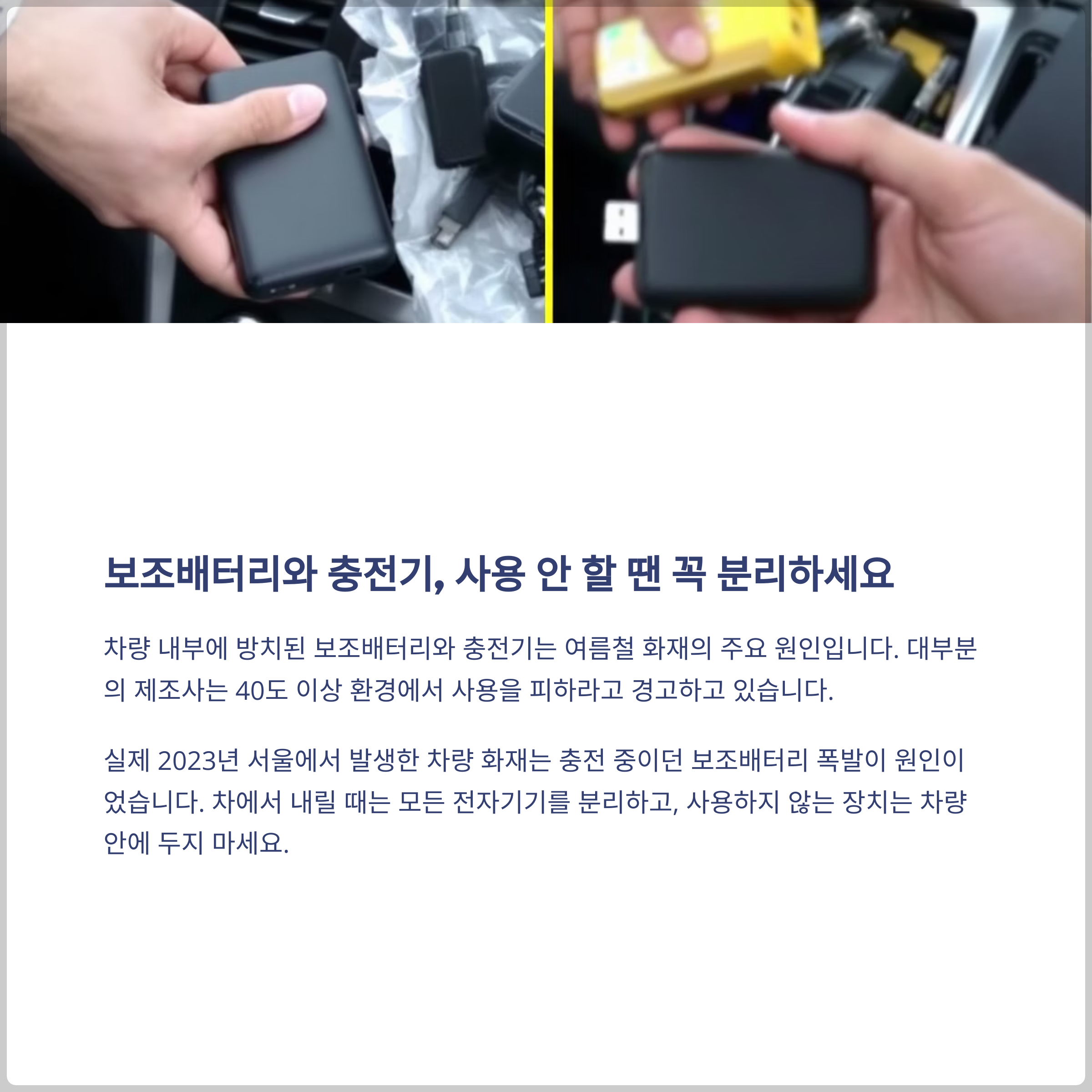 차량 내부에서 스마트폰 충전용 보조배터리나 점퍼스타터 등 다양한 전자기기를 사용하는 경우가 많습니다. 그러나 이들 기기 역시 고온에 매우 취약하며, 제조사에서도 40도 이상의 환경에서는 사용을 피하라고 경고하고 있습니다. 실제로 2023년 여름 서울에서 발생한 차량 화재의 경우, 충전 중이던 보조배터리가 폭발한 것으로 확인되었습니다. 차를 떠날 땐 반드시 모든 전자기기를 분리하고, 사용하지 않는 장치는 차량 안에 방치하지 말아야 합니다.