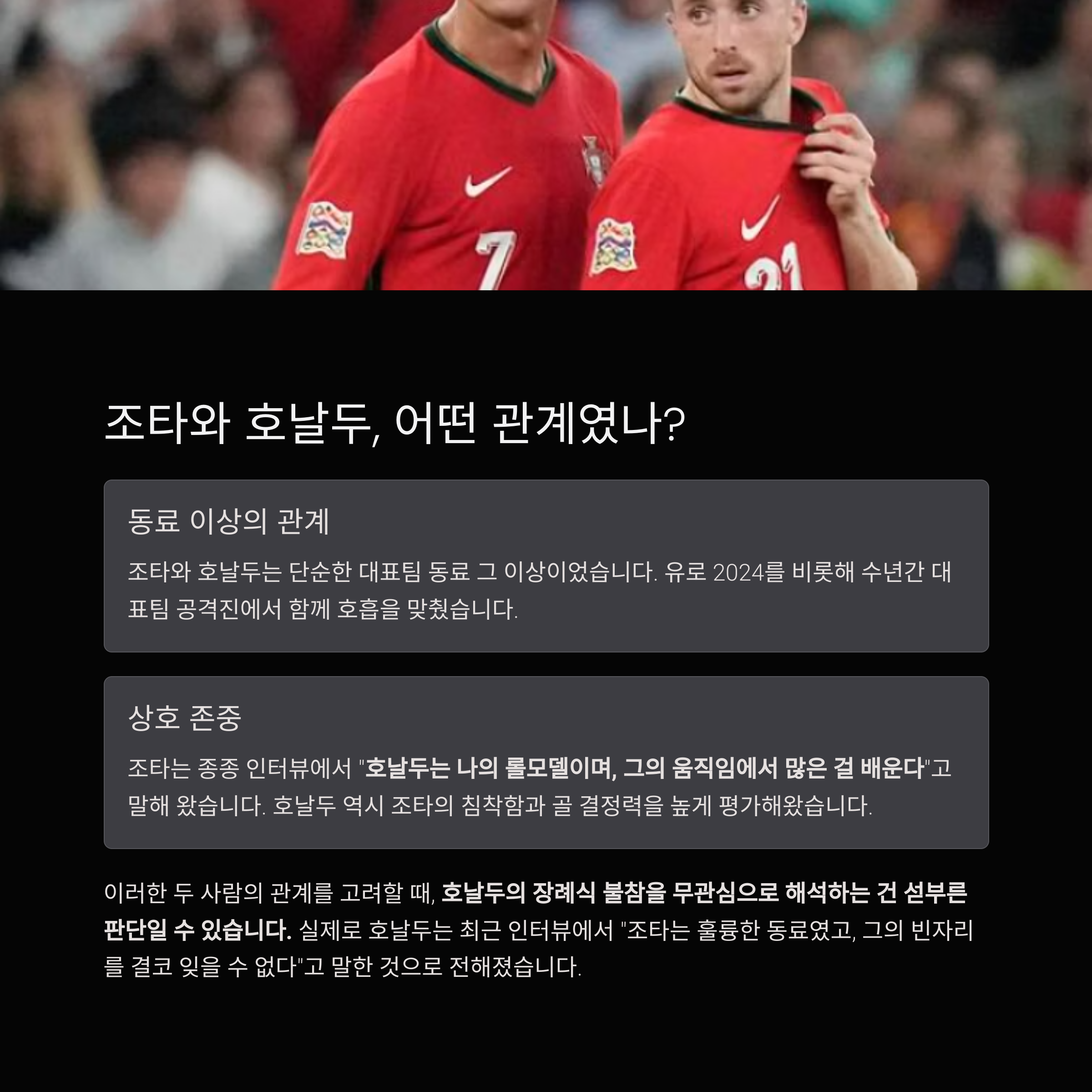 유로 2024를 비롯해 수년간 대표팀 공격진에서 함께 호흡을 맞췄고, 조타는 종종 인터뷰에서 “호날두는 나의 롤모델이며, 그의 움직임에서 많은 걸 배운다”고 말해 왔습니다.
