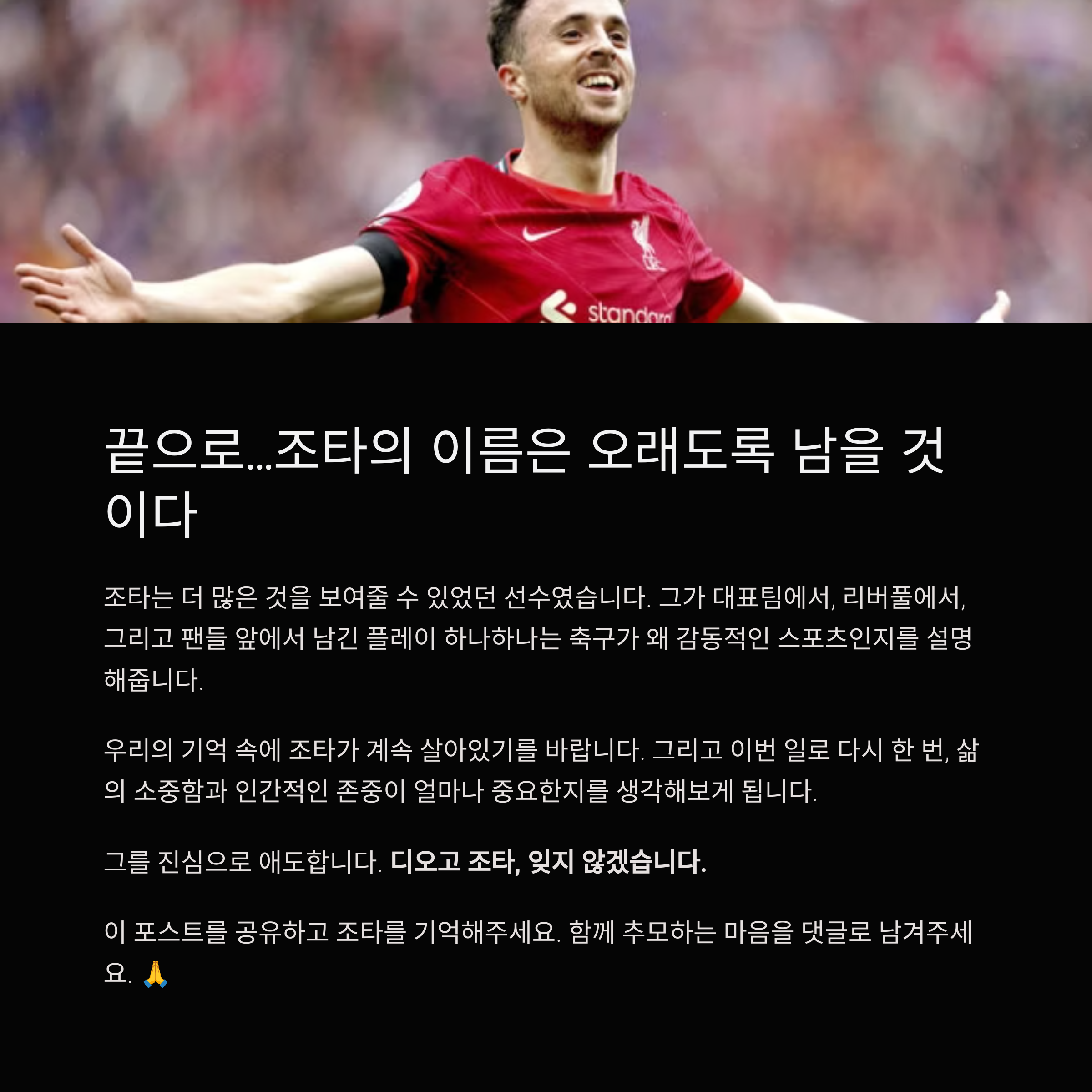 조타는 더 많은 것을 보여줄 수 있었던 선수였습니다. 그가 대표팀에서, 리버풀에서, 그리고 팬들 앞에서 남긴 플레이 하나하나는 축구가 왜 감동적인 스포츠인지를 설명해줍니다.