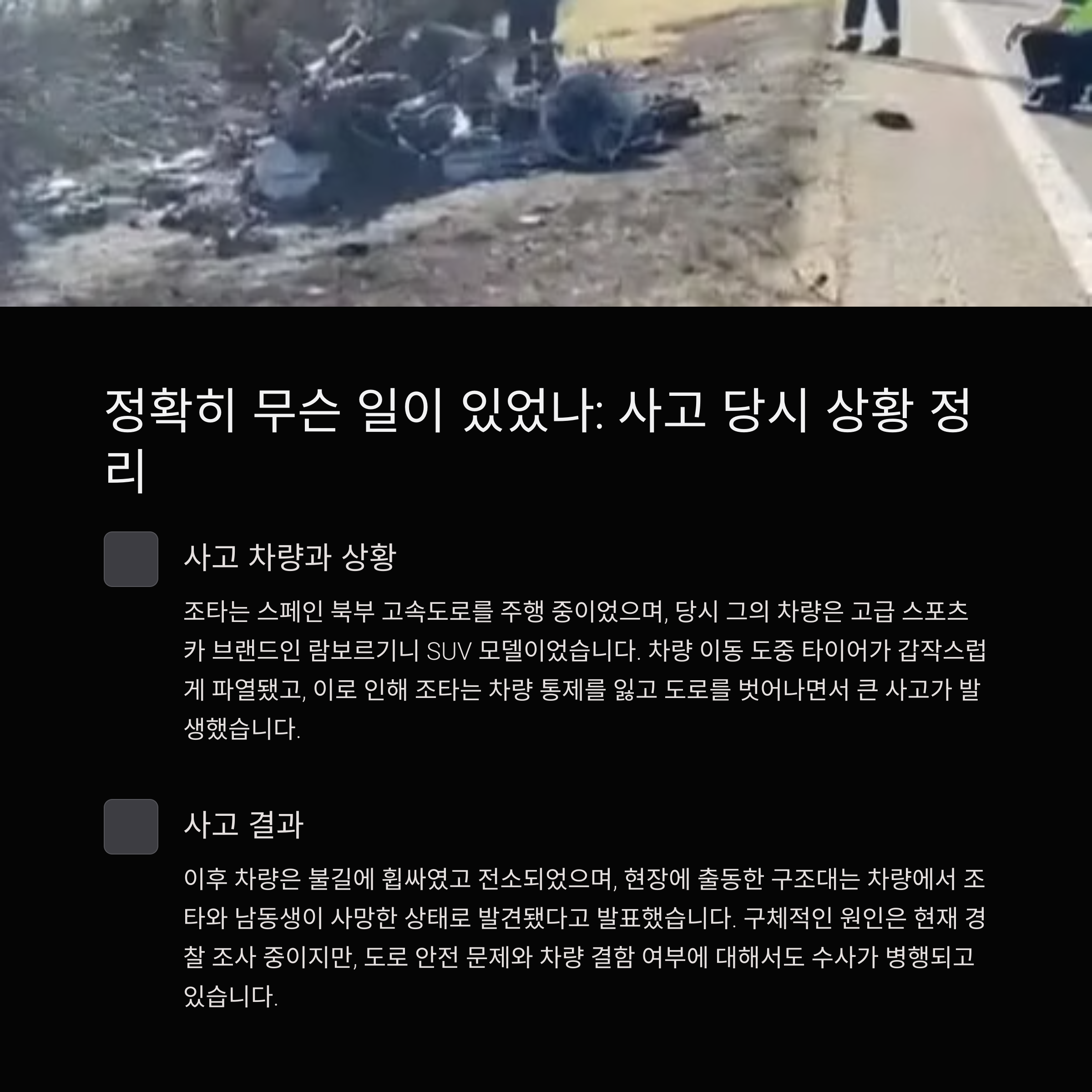 현지 경찰과 언론 보도에 따르면, 조타는 스페인 북부 고속도로를 주행 중이었으며, 당시 그의 차량은 고급 스포츠카 브랜드인 람보르기니 SUV 모델로 확인됐습니다. 차량 이동 도중 타이어가 갑작스럽게 파열됐고, 이로 인해 조타는 차량 통제를 잃고 도로를 벗어나면서 큰 사고가 발생했습니다.