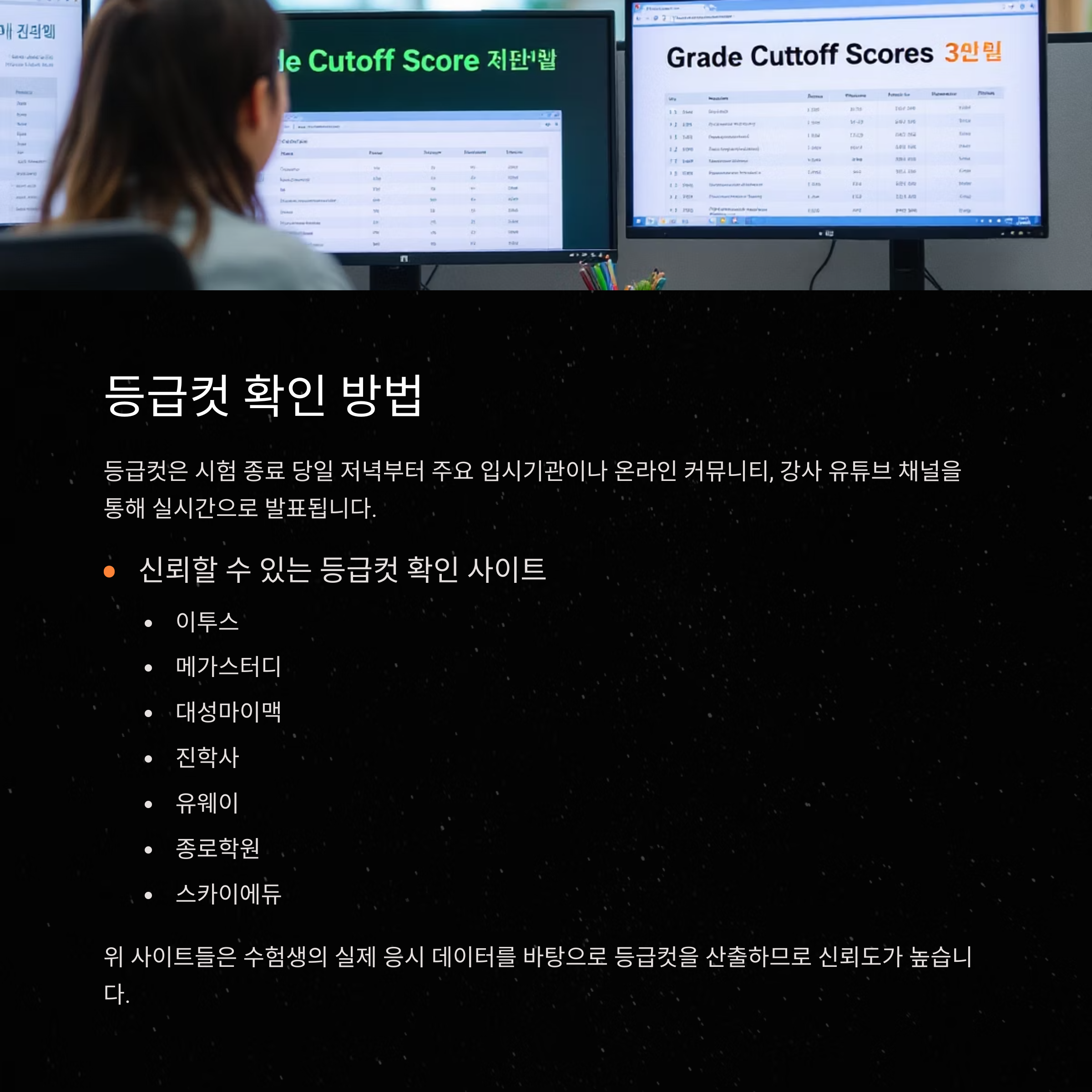 위 사이트들은 수험생의 실제 응시 데이터를 바탕으로 등급컷을 산출하므로, 신뢰도 면에서 매우 높습니다. 특히 시험 직후 공개되는 실시간 추정 등급컷과 며칠 뒤 발표되는 확정 등급컷을 비교해보는 것도 좋습니다.