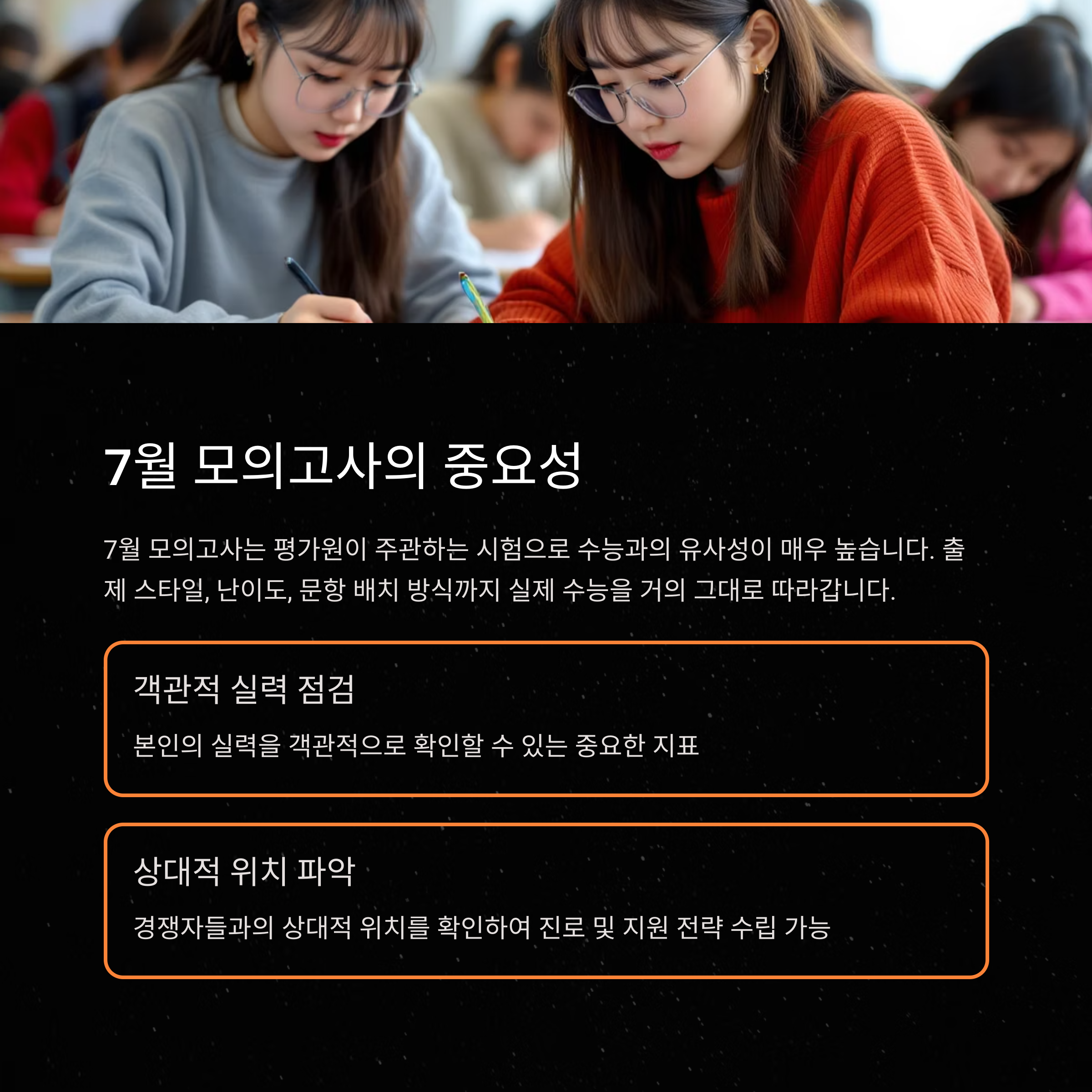 이 때문에 7월 모평은 수험생 본인의 실력을 객관적으로 점검하는 지표로 매우 중요한 시험입니다. 특히 등급컷을 통해 어떤 과목에서 점수가 부족한지, 경쟁자들과의 상대적인 위치는 어떤지 확인할 수 있기 때문에 진로 및 지원 전략에도 큰 영향을 줍니다.