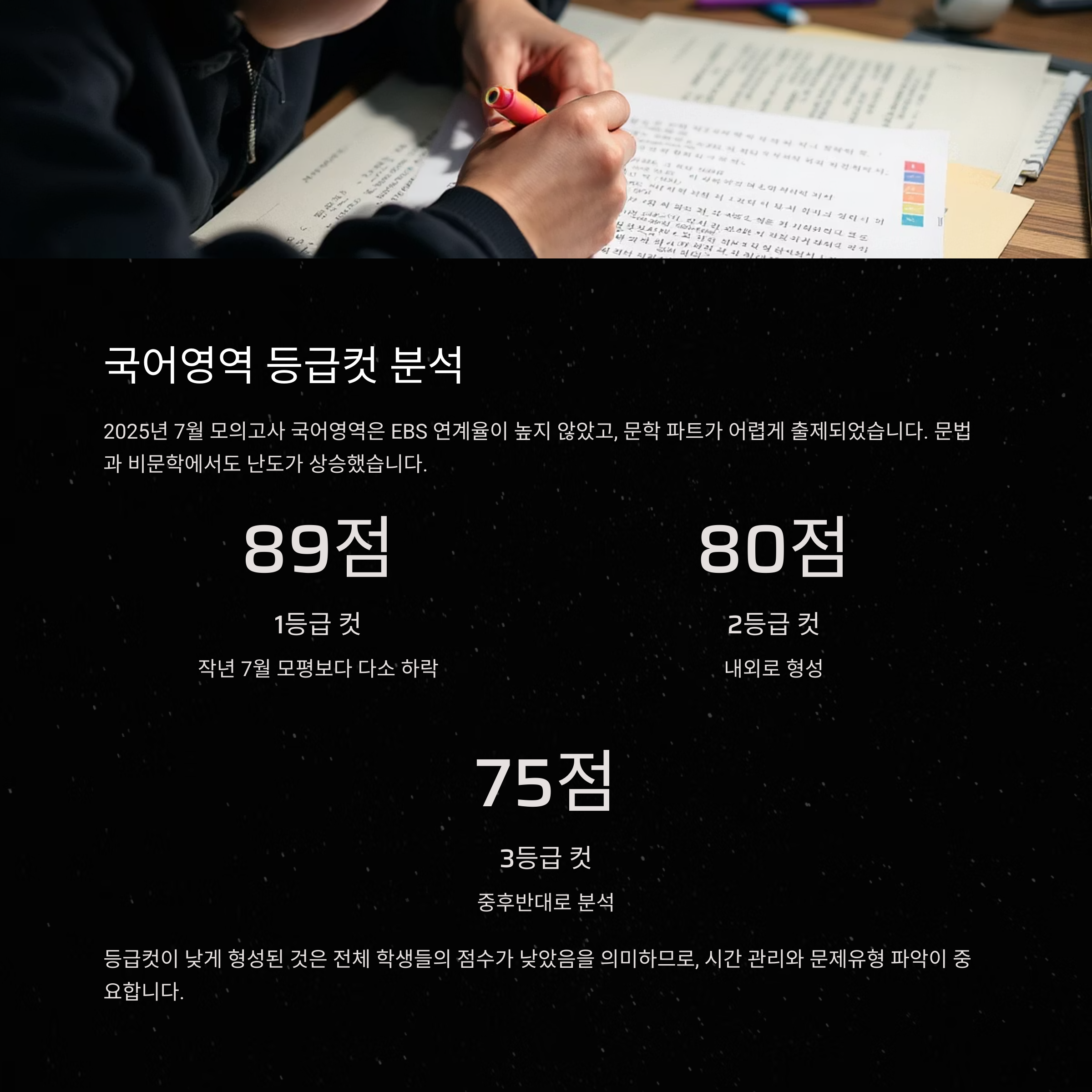 국어 1등급 컷은 시험 직후 메가스터디 기준으로 89점 전후로 추정되었으며, 이는 작년 7월 모평보다 다소 하락한 수치입니다. 2등급은 80점 내외, 3등급은 70점대 중후반으로 분석되고 있습니다.