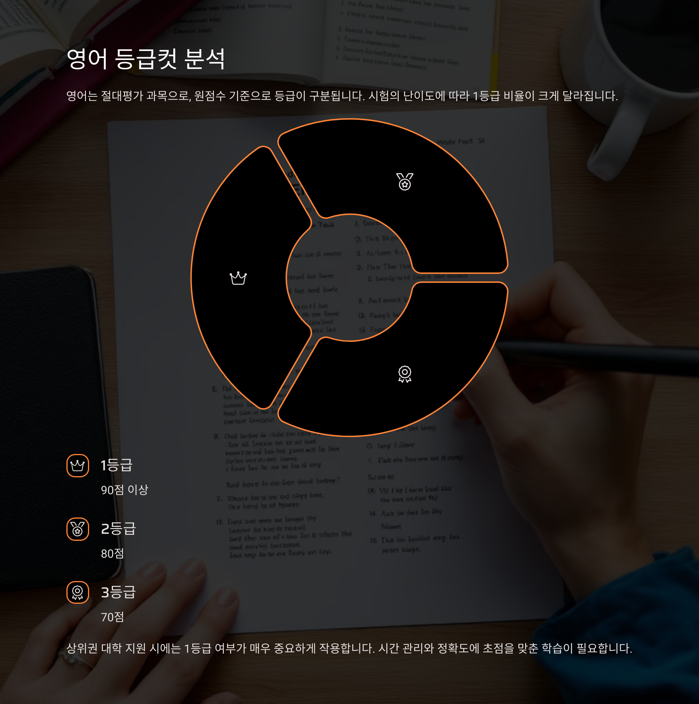 영어는 절대평가 과목입니다. 따라서 영어 등급컷은 원점수 기준으로 구분되며, 시험의 난이도에 따라 1등급 비율이 크게 달라집니다.