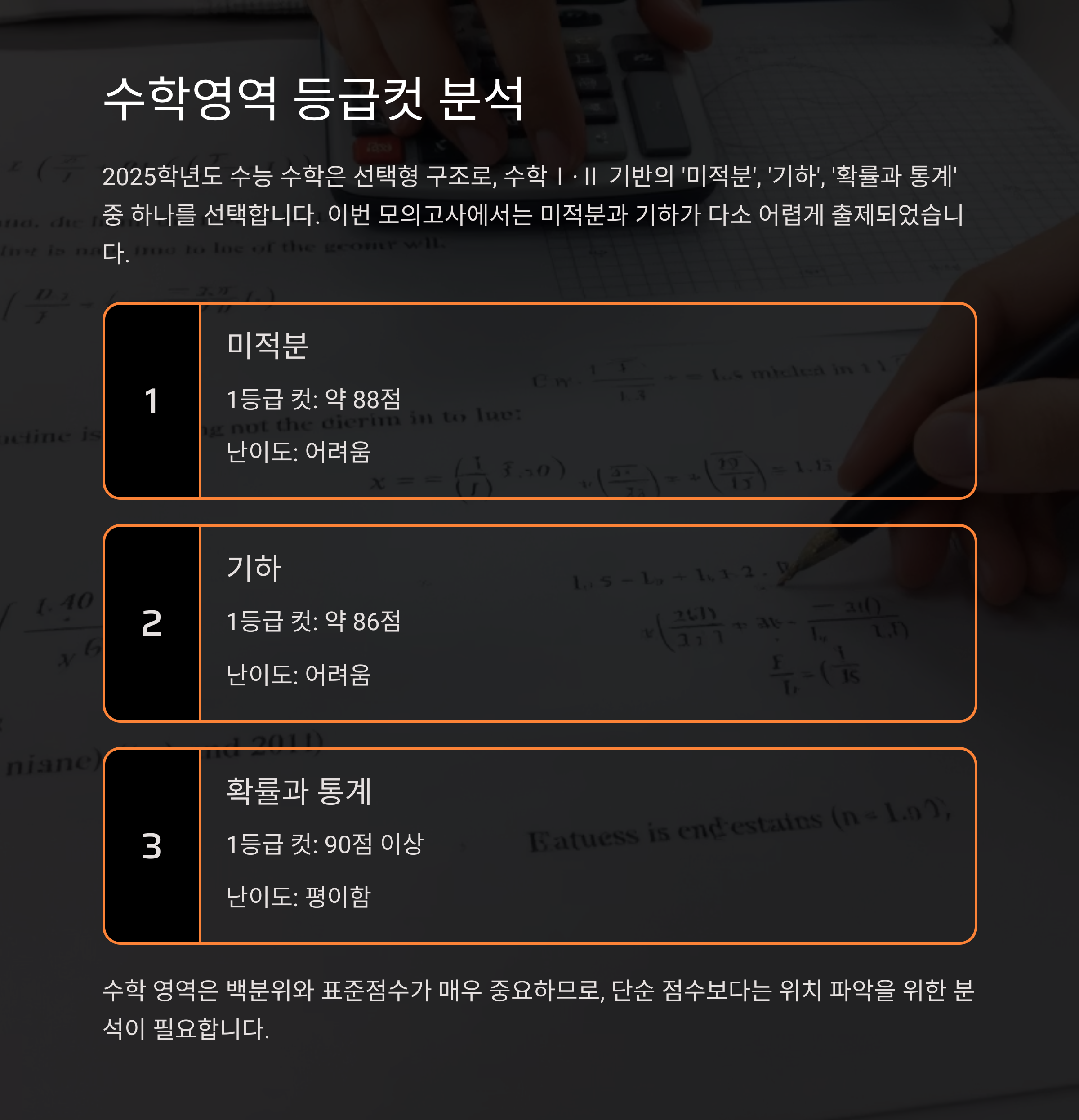 수학 1등급 컷은 미적분 기준 약 88점, 기하 기준 약 86점, 확통은 상대적으로 평이하게 출제되어 90점 이상으로 추정되었습니다. 과목별 난이도 차이로 인해 원점수와 표준점수의 괴리가 발생하고 있어, 등급컷만을 맹신하기보다는 자신의 선택 과목 내 위치를 면밀히 살펴야 합니다.