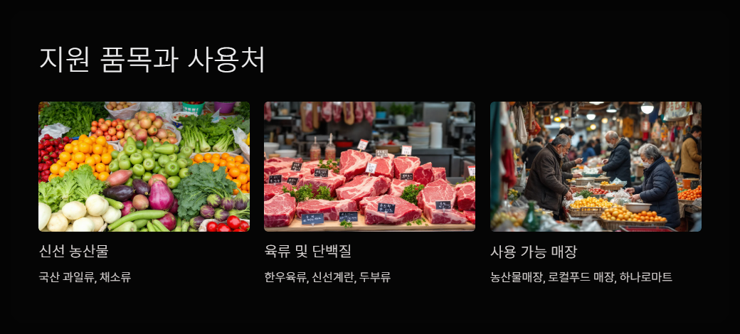 사용 가능한 품목은 국산 과일류, 채소류, 한우육류, 신선계란, 두부류 등으로 제한되며, 일반 가공식품, 라면, 음료, 생활용품 등은 구매할 수 없습니다.