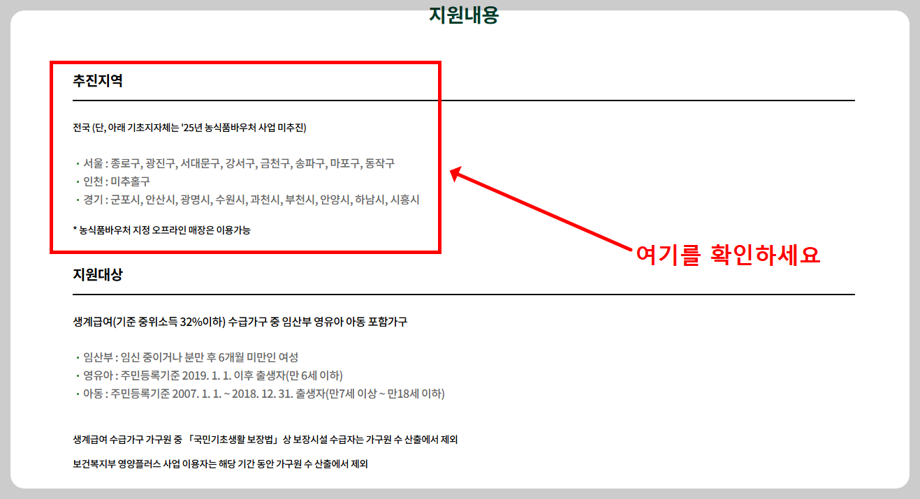 2025년 농식품바우처는 전국적으로 확대 시행된다. 단, 2024년까지 시범사업을 마친 지역은 별도 선정 없이 그대로 시행되며, 사업미추진 지역은 다음과 같다. 서울의 종로구, 광진구, 서대문구, 강서구, 금천구, 송파구, 마포구, 동작구, 인천은 미추홀구, 경기도는 군포시, 안산시, 광명시, 수원시,과천시, 부천시, 안양시, 하남시, 시흥시, 바우처 지정 오프라인 매장 이용 가능하다는 점도 고려해야 한다